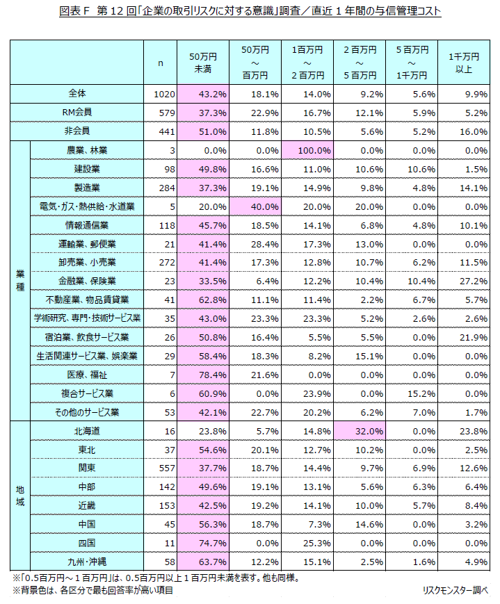 一方、与信管理コストが「5百万円以上」と回答した企業の割合を見ると、非会員(回答率計21.2%)がRM会員(同11.1%)の約2倍に達しており、非会員では高コストで与信管理業務を行っている企業が多いことがうかがえます。(図表F)