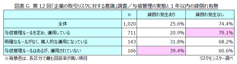 この結果から、与信管理ルールの運用状況と貸倒れの発生には、一定の関連性があることがうかがえます。(図表G)