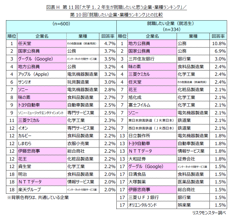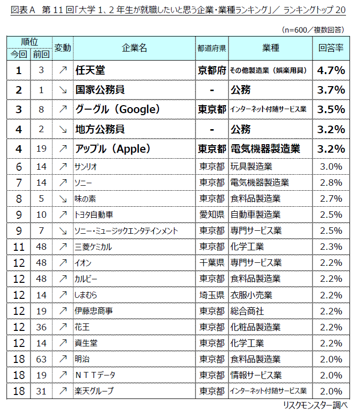 過去10回の調査のうち、8回で公務員がトップ2を占めていましたが、今回の調査では「任天堂」が2回ぶりに1位となったほか、前回8位の「Google」が3位にランクインしたことで、「地方公務員」はトップ3から陥落しました。