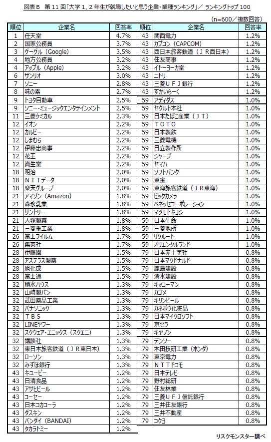 ・調査名称:第11回「大学1、2年生が就職したいと思う企業・業種ランキング」調査