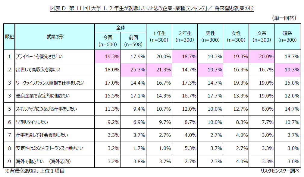 将来望む就業の形を聞いたところ、最も多かったのは「プライベートを優先させたい」(回答率19.3%)で、「出世して高収入を得たい」(同18.0%)、「ワークライフバランス重視で仕事をしたい」(同17.0%)、「優良企業で安定的に働きたい」(同15.5%)の順となりました。 前回調査では「出世して高収入を得たい」が最多回答でしたが、今回はプライベートや、ワークライフバランスを重視する回答が増加しています。さらに属性別で見ると、1年生や男性は「出世・高収入」志向が、2年生や女性は「プライベート優先」志向が強い傾向が見られました。(図表D)