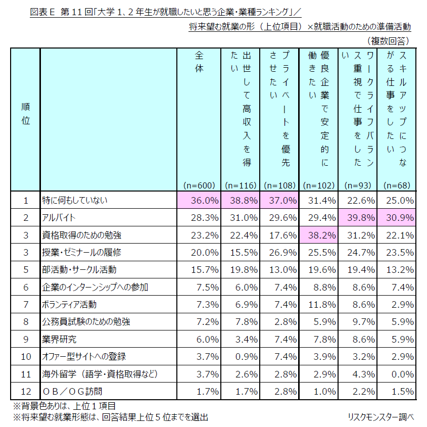 将来望む就業の形と、就職活動のための準備活動の関係性を集計したところ、「アルバイト」、「資格取得のための勉強」、「授業・ゼミナール履修」に取り組んでいる学生はいずれも2割以上となった一方で、3人に1人は「特に何もしていない」ことが明らかとなりました。「プライベートを優先させたい」や「出世して高収入を得たい」と考える学生においても、4割近くは「特に何もしていない」と回答しており、希望に対して行動が伴っていない学生の多い様子が表れています。(図表E)