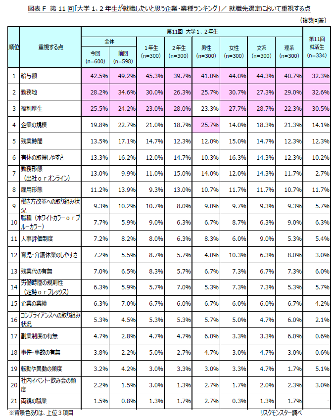 就職先選定において重視する点を聞いたところ、「給与額」(回答率42.5%)が前回調査に続き最多となり、次いで「勤務地」(同28.2%)、「福利厚生」(同25.5%)が続きました。前回調査から引き続き待遇面を重視する傾向が見られます。男女別に見ると、女性では「残業時間」、「有休の取得しやすさ」、「育児・介護休業制度」などのワークライフバランスに関連する項目の回答率が、男性に比べて高い結果となりました。(図表F)