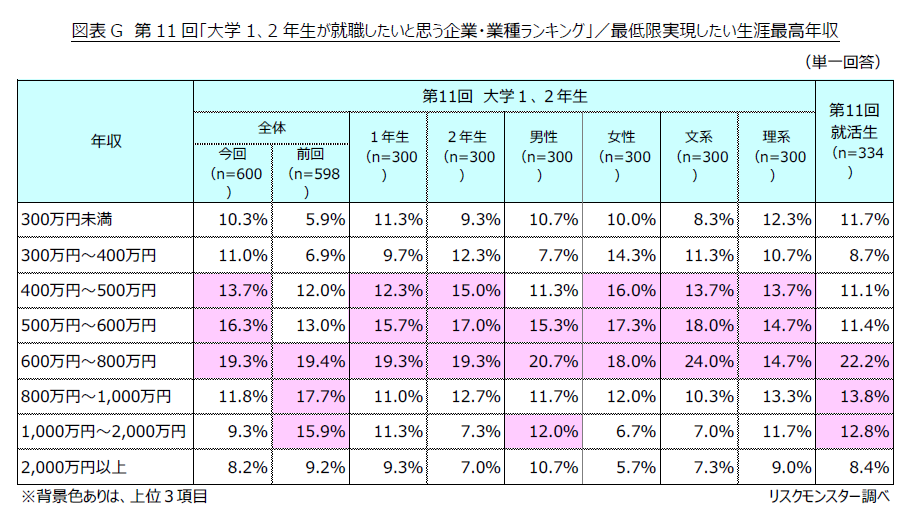 さらに、「給与額」について、最低限実現したい生涯最高年収を調査したところ、「600~800万円」(回答率19.3%)が最多となり、前回調査と同様でした。一方で、「800万円以上」(合計回答率29.3%)を望む割合が前回(同42.8%)から13.5ポイント低下し、「400万円未満」(同21.3%)が8.5ポイント増加、全体としては希望年収が低下していることが読み取れます。(図表G)