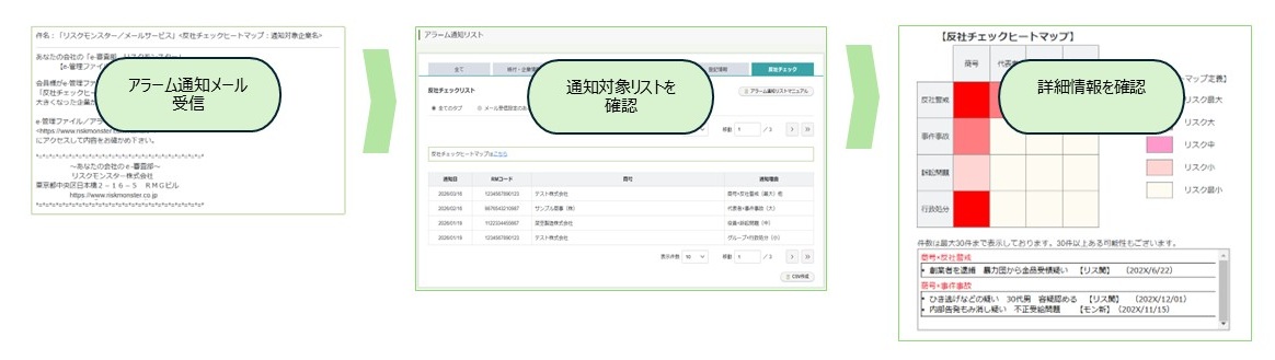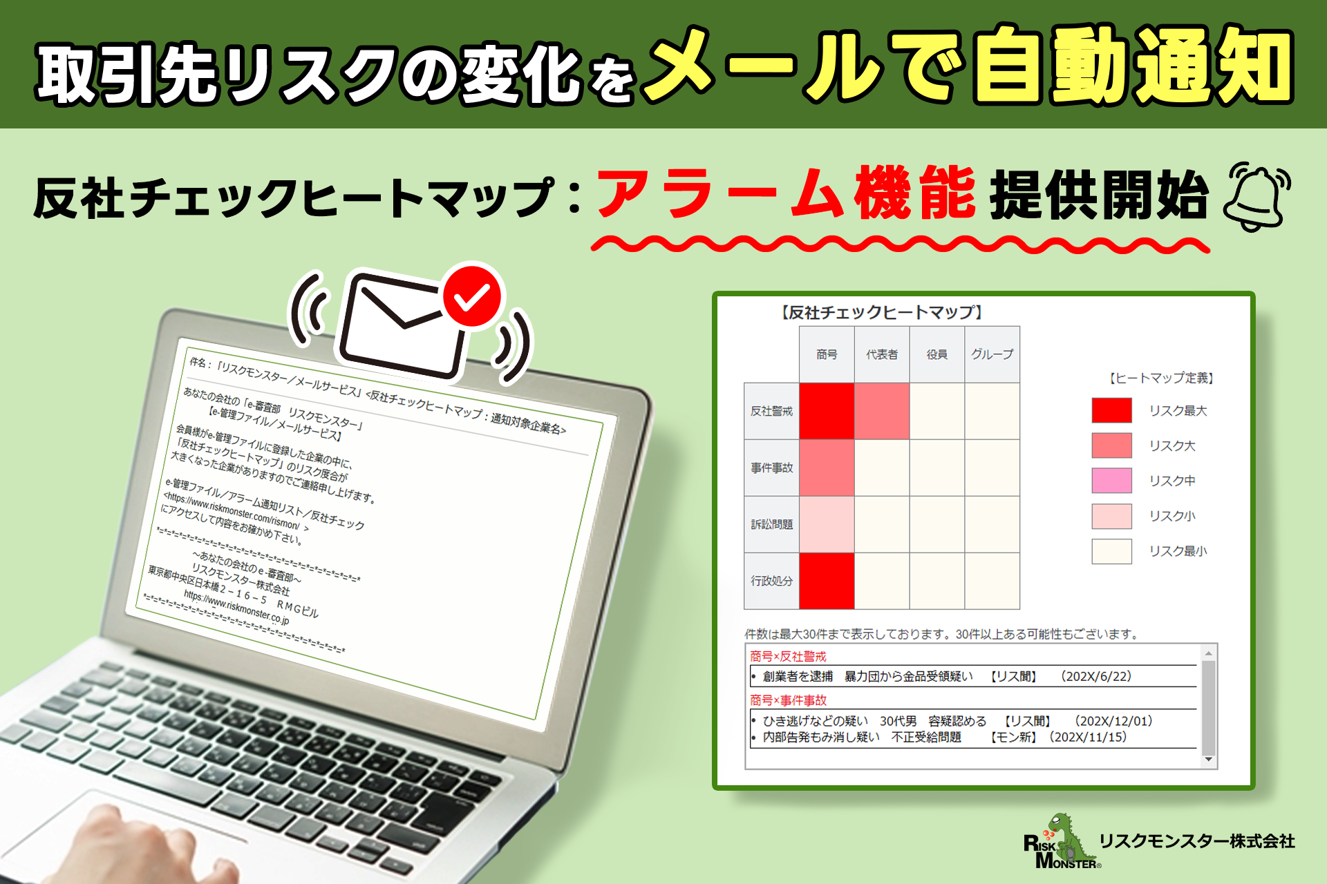 リスクモンスターはこれらのニーズに応え、取引先のリスク変化を見逃さない仕組みとして、「反社チェックヒートマップ:アラーム通知」を新たに提供開始します。