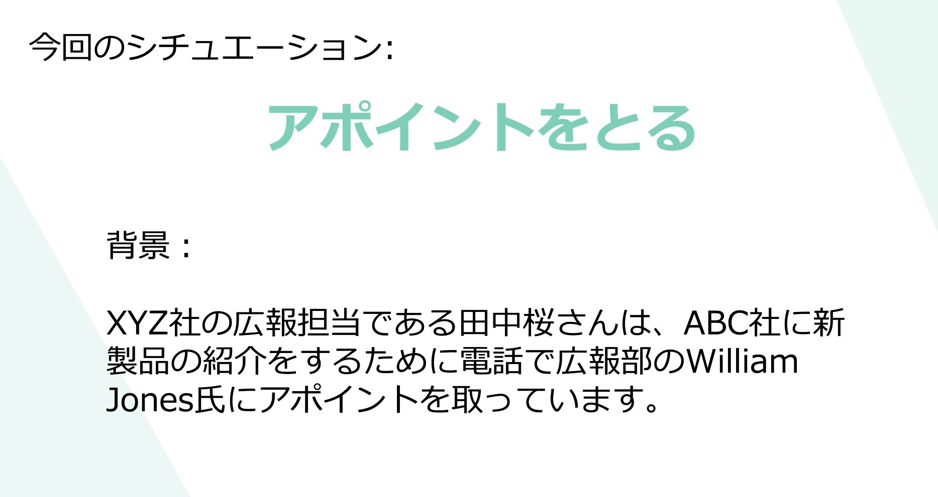 「アポイントをとる」場面について、英語で「アポイントの取り方」を練習します。