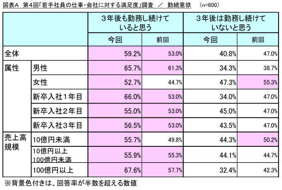 本調査において若手社員の5人に2人は3年以内の退職を考えている結果となった一方で、3年後も勤続する意向の若手社員の割合は前回から6.3ポイントの上昇となり、調査開始以来最多となりました。