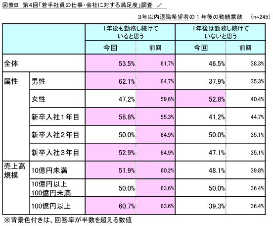 男女別では、「3年後も勤続」は、男性(回答率65.7%)、女性(同52.7%)ともに過半数となり、女性においては、前回から8.0ポイント増加し、初めて半数を超えました。