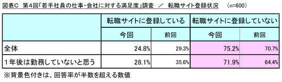 また若手社員の転職活動状況に関して転職サイトへの登録状況を調査したところ「転職サイトに登録している」と回答した若手社員は24.8%であり、前回(回答率29.3%)から4.5ポイントの低下となりました。「1年以内に退職」と回答した若手社員の転職サイト登録率(同28.1%)も前回(同35.6%)から7.5ポイント低下しており、転職に向けた具体的な行動を起こしていない人が増加している傾向がうかがえます。(図表C)
