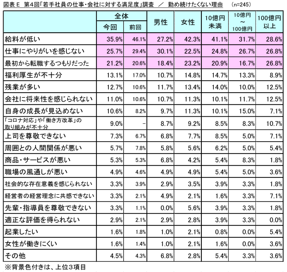 男女別では、男性において「仕事にやりがいを感じない」(同30.1%)、女性において「給与が低い」(同42.3%)という回答が異性に比べて高い結果となりました。売上高規模別では、売上高規模の小さい会社において、給料・福利厚生に不満が生じている傾向がうかがえます。(図表E)