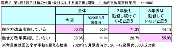 働き方改革の実施有無が勤続意欲に与える影響をみると「3年後も勤続」と回答する若手社員が務める企業は、7割以上が「働き方改革実施」(同71.3%)である一方で、「3年以内に退職」と回答する若手社員が務める企業においては、半数以上が「働き方改革未実施」(同55.9%)であることがわかりました。(図表F)