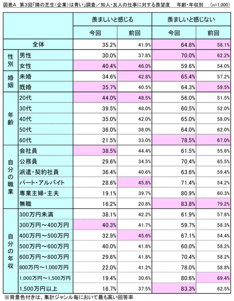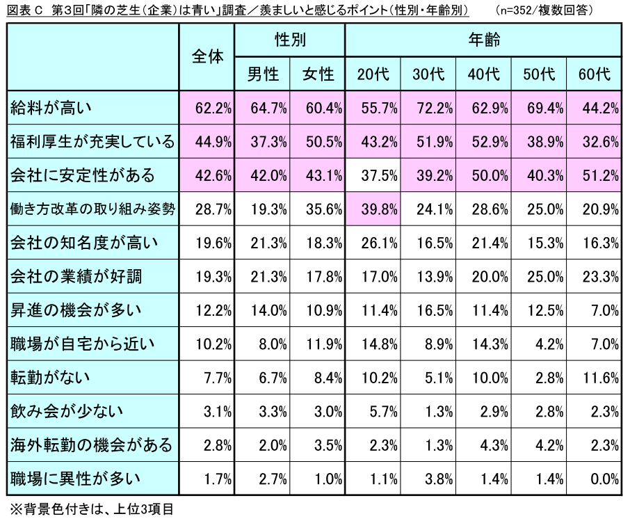 今回の調査によれば3人に1人が知人や友人の勤務先について羨ましいと感じており、男性よりも女性、そして若年層ほど羨ましいと感じやすいという結果となりました。その一方で前回調査からは羨ましいと感じない割合が6.7ポイント上昇しており、以前よりも隣の芝生(企業)が青く見えにくくなっている傾向が表れています。