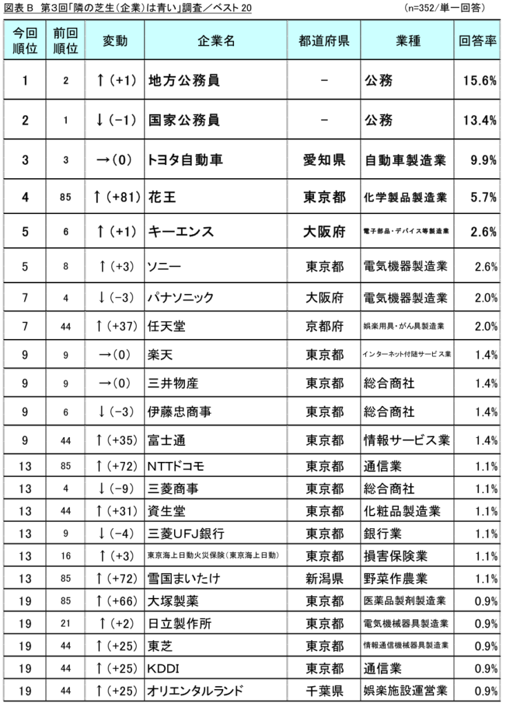 第1回・第2回「隣の芝生(企業)は青い企業ランキング」の結果と比較したところ、過去の調査に続いて「公務員」が上位を独占しており、公務員に対する羨望度の高さがうかがえます。民間企業の中では「トヨタ自動車」(同9.9%)が第1回から3回連続1位となり、2位の「花王」(同5.7%)に4.2ポイントの大差をつけていることから、民間企業における「トヨタ自動車」への羨望度の高さが際立つ結果となりました。