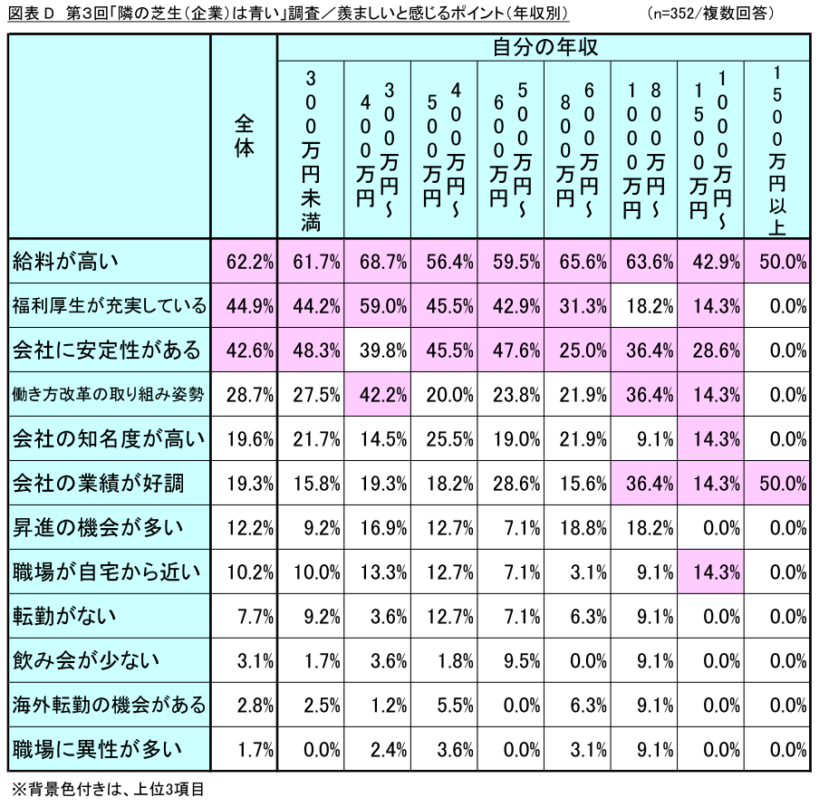 また、羨ましいと思うポイントを年収別に集計したところ、800万円以上の高収入層において「会社の業績が好調」や「働き方改革の取り組み姿勢」の回答率が高い結果となりました。(図表D)