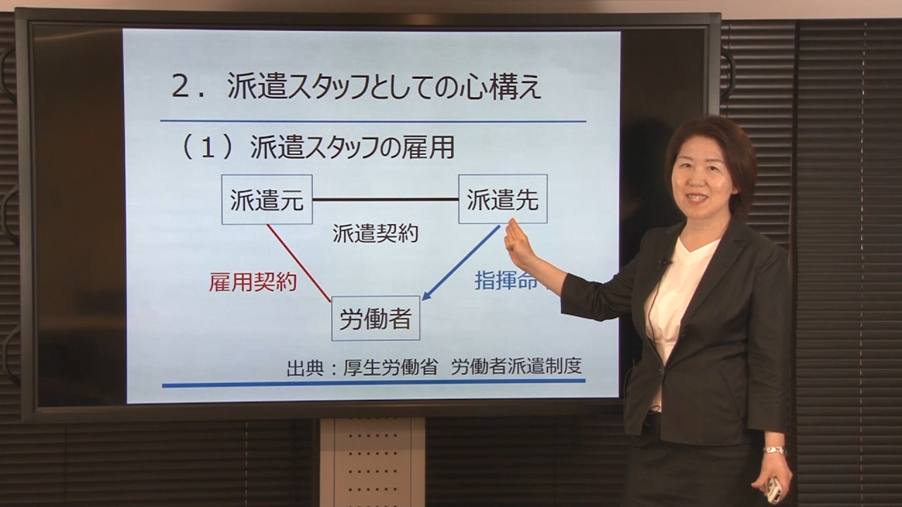 【概要】派遣スタッフが派遣先の社員と協力して働けるよう、自身と派遣会社・派遣先企業との関係性について理解し、社会人としてのマナーの基本を学びます。