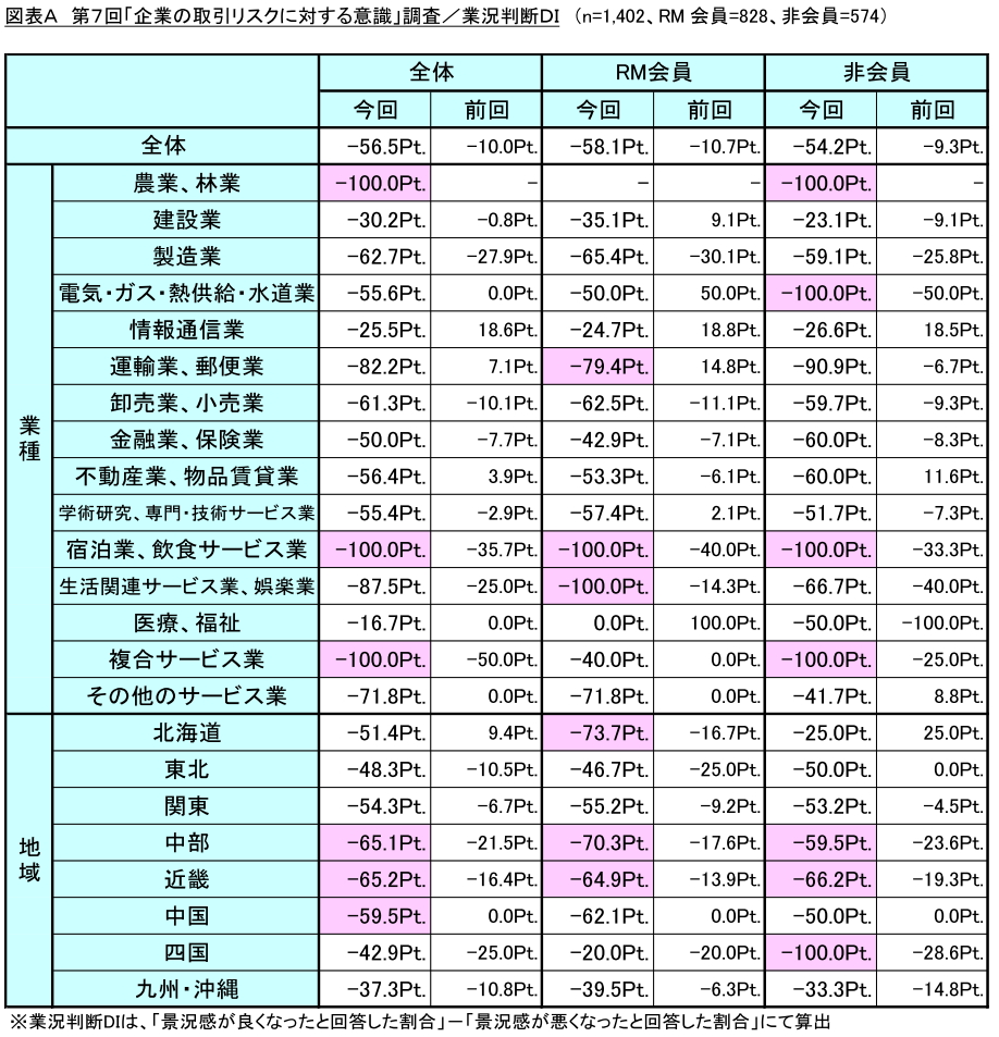 過去6回にわたり実施してきた「企業の取引リスクに対する影響アンケート」の中でも今年度の景況感は過去に類を見ない悪化となっており、緊急事態宣言以降の消費減退が景気に与える影響の大きさを浮き彫りにしています。