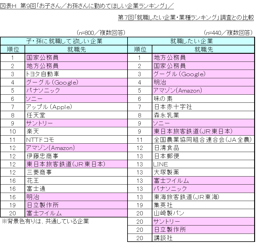 今回の調査結果を2022年3月に就職を控えた大学3年生を対象に実施した、第7回「就職したい企業・業種ランキング」調査と比較したところ、両調査で「国家公務員」、「地方公務員」が1位、2位を占めており、子・孫に勤めてほしい先も自身が勤務したい先も、「安定性」が重視されている様子が表れているといえます。(図表H)