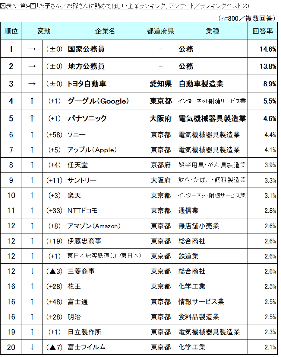 第8回「お子さん/お孫さんに勤めてほしい企業ランキング」の結果と比較したところ、トップ3の順位は変動なく、前回に続き1位「国家公務員」、2位「地方公務員」と公務員人気の根強さがみられました。また、3位の「トヨタ自動車」は、第1回調査から民間企業における1位を維持しており、民間企業の中では不動の地位を築いています。