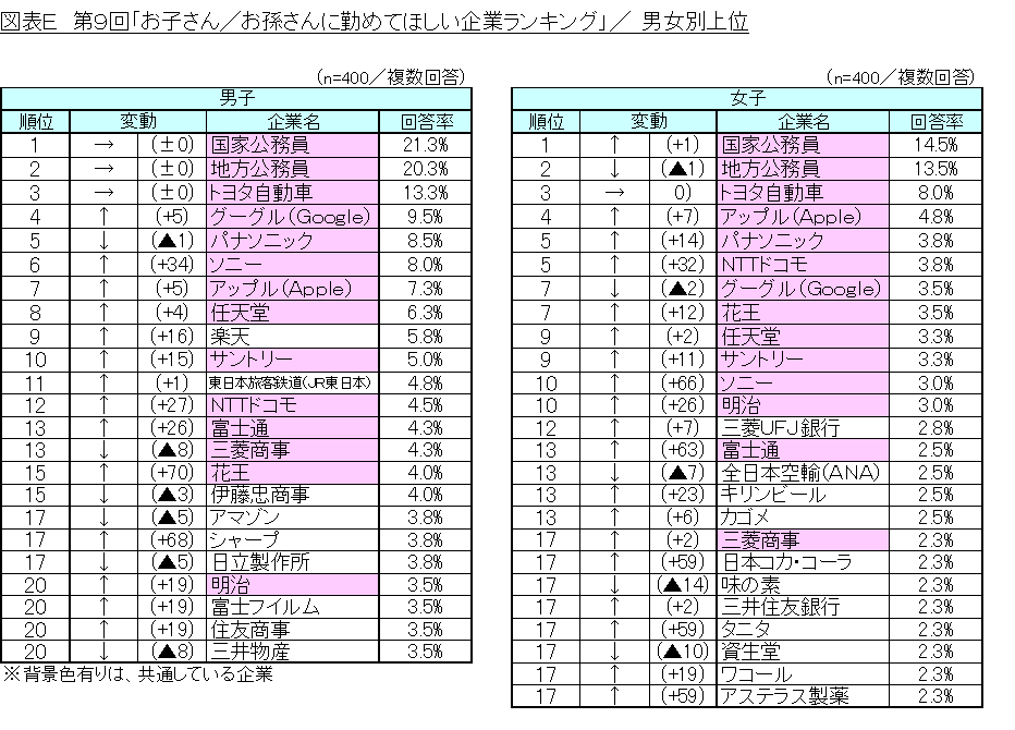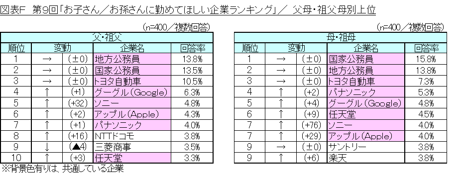 「子・孫」別、「男子・女子」別、「父、祖父」・「母、祖母」別を比較したところ、いずれの集計においても「国家公務員」、「地方公務員」、「トヨタ自動車」がトップ3となっており、全てのセグメントで人気を博しています。(図表E、F)