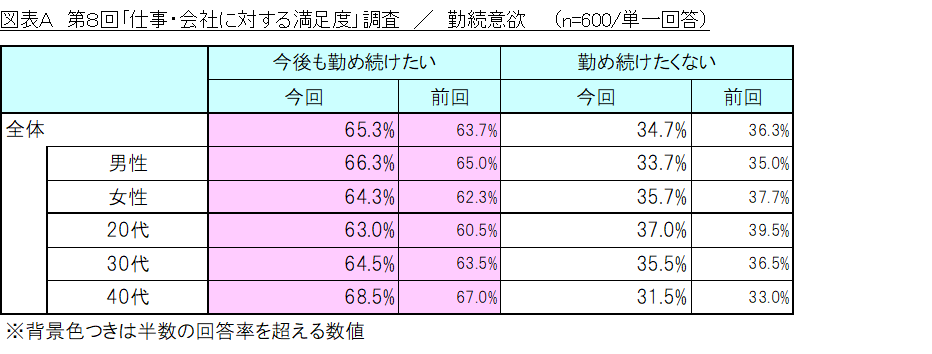 本調査によれば、3人に2人が現在の勤務先に「今後も勤め続けたい」と考えていることが分かりました。男女別・性別いずれも「勤続希望」が前年よりも増加しており、現在勤めている会社に対する帰属意識の高まりがうかがえます。