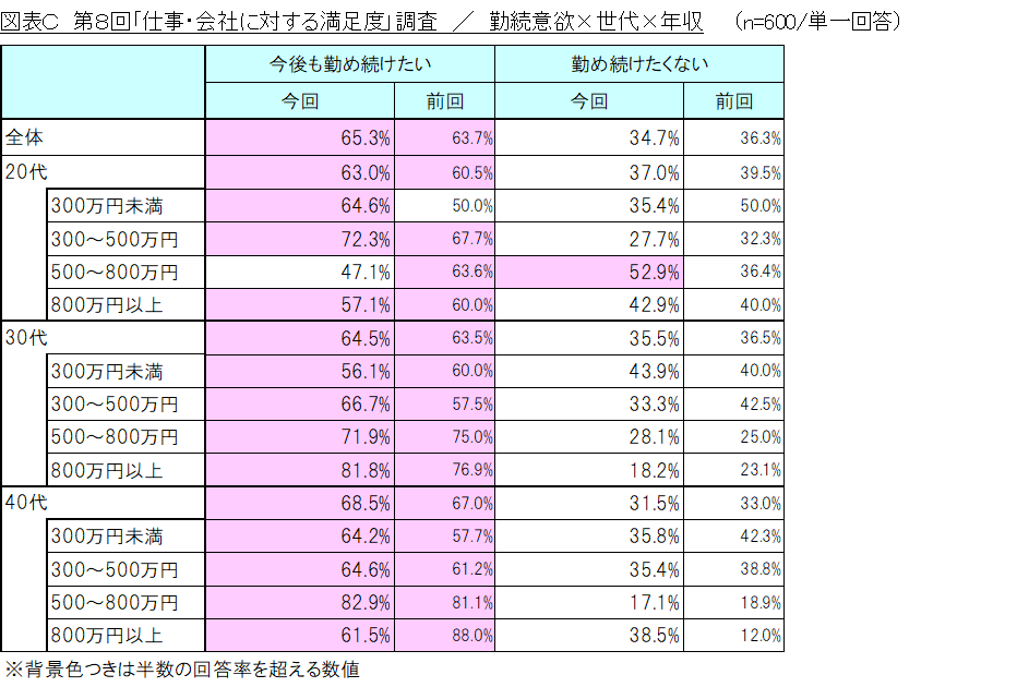 さらに、勤続意欲を世代別、年収別に集計したところ、「20代・500~800万円」(同52.9%)、次いで「30代・300万円未満」(同43.9%)、「20代・800万円以上」(同42.9%)における退職希望が強い様子が表れる結果となりました。(図表C)