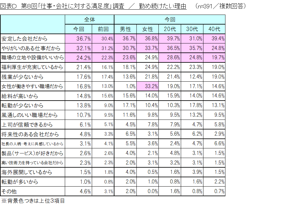 「勤続希望」の理由を尋ねたところ、1位「安定した会社だから」(回答率36.7%)、2位「やりがいのある仕事だから」(同32.1%)、3位「職場の立地や設備がいいから」(同24.2%)となりました。前回調査から1位と2位が入れ替わり、「安定した会社だから」が1位となりました。