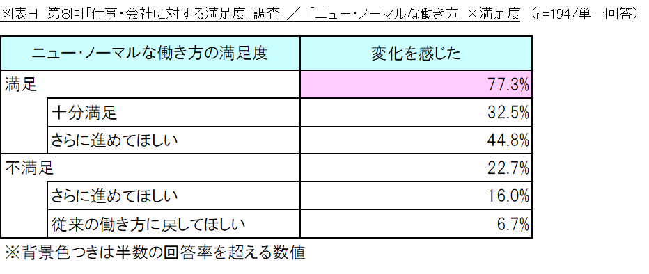 また、直近1年間でニュー・ノーマルに変化したと感じた人を対象に、新たな働き方の満足度について調査したところ、「満足」(同77.3%)、「不満足」(同22.7%)となり、約8割の人が満足している結果となりました。ニュー・ノーマルに変化したと感じた人のうち、「従来の働き方に戻してほしい」は6.7%であり、ニュー・ノーマルな働き方を体感している大半の人は新たな働き方に好感をもっている様子がうかがえます。(図表H)