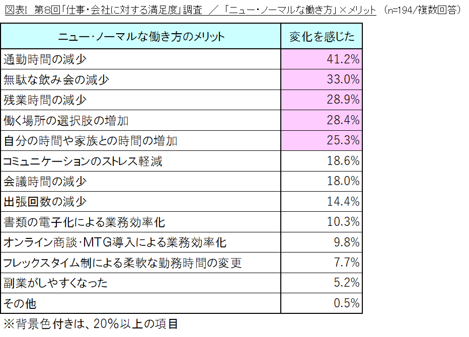 「変化を感じた」と回答した人にニュー・ノーマルな働き方のメリットについて調査したところ、1位「通勤時間の減少」(同41.2%)、2位「無駄な飲み会の減少」(同33.0%)、3位「残業時間の減少」(同28.9%)、4位「働く場所の選択肢の増加」(同28.4%)、5位「自分の時間や家族との時間の増加」(同25.3%)となりました。「テレワーク(在宅勤務)」や「残業時間の制限」によるメリットが大半を占め、時間的メリットを強く感じていることが表れる結果となりました。(図表I)