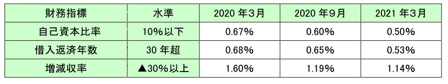 経済環境や景気動向の変化により、倒産のトレンドは常に変化しております。下表のとおり、2020年3月から2021年3月の1年間で比較しても、各財務指標における要警戒領域の倒産確率も変化が生じていることが分かります。これらの倒産トレンドの変化に対応するために、定期的に倒産実績の集計を行い、格付と倒産確率の乖離が生じないように調整を行っております。
