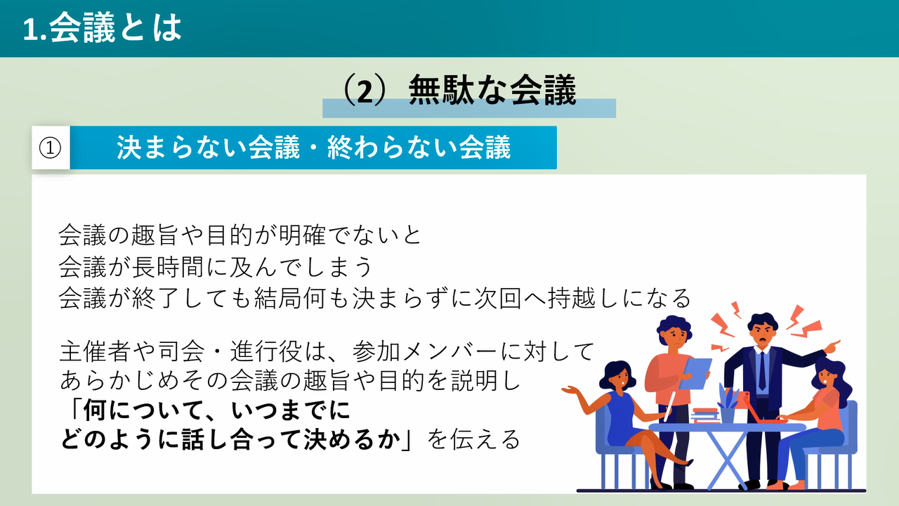 【概要】会議に関わる主催者や進行役であるファシリテーターの役割に加え、参加メンバーが当事者としてどのように会議に関わればよいのかを解説します。