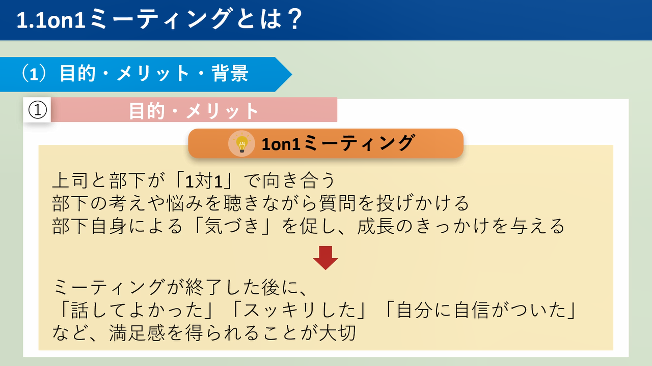 【概要】部下を持つ管理職が1on1ミーティングを実施するときの心がまえや実施手順、ミーティングを成功させるためのコツについて解説します。