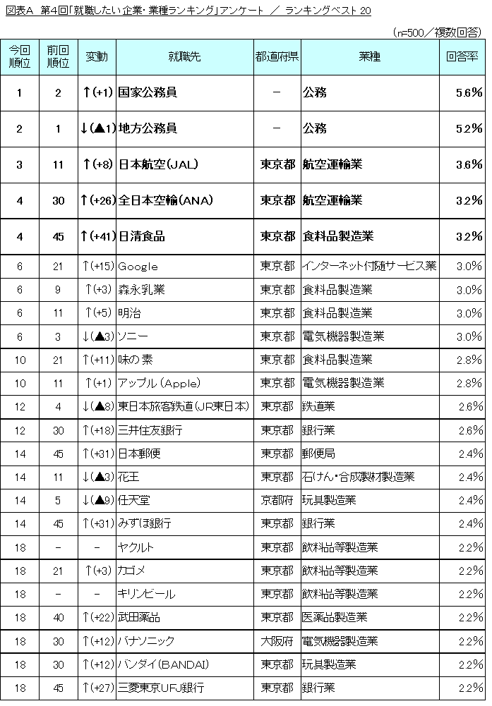 「就職したい企業・業種ランキング」のランキング1位は「国家公務員」(回答率5.6%)でした。次いで「地方公務員」が2位(同5.2%)、「日本航空(JAL)」が3位(同3.6%)となりました。以下、4位「全日本空輸(ANA)」、「日清食品」、(同3.2%)、6位に「Google」、「森永乳業」、「明治」、「ソニー」(同3.0%)、10位「味の素」、「アップル(Apple)」(同2.8%)と続きました。(図表A)