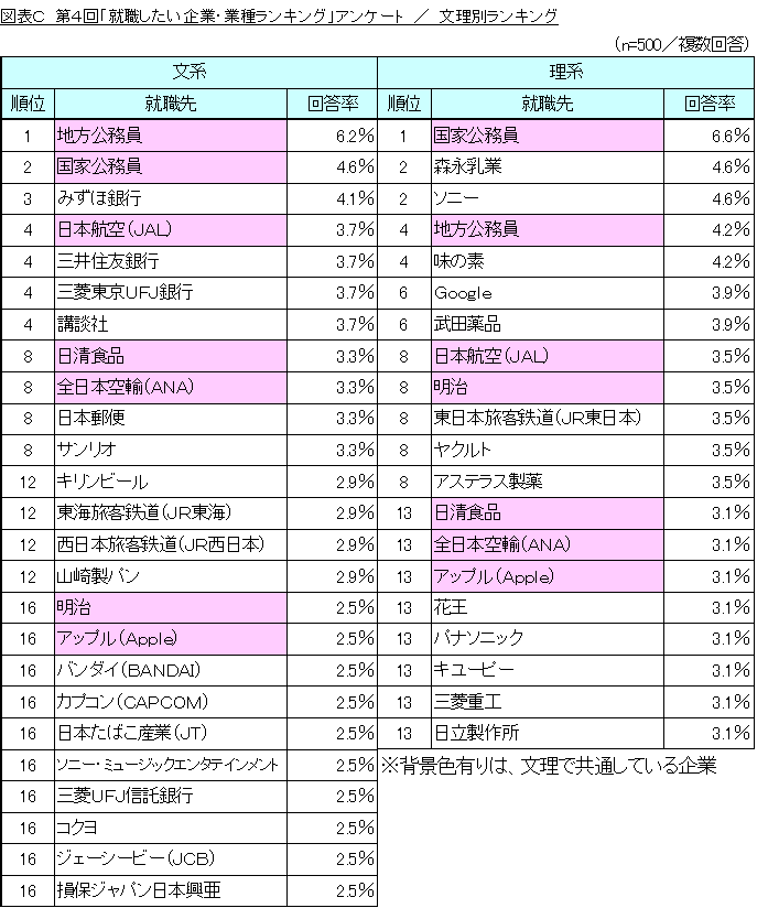 これに対して、理系学生が望む就職先のランキング1位は「国家公務員」(回答率6.6%)となり、次いで「森永乳業」、「ソニー」(同4.6%)が2位、「地方公務員」、「味の素」(同4.2%)が4位となりました。前回との比較では「資生堂」(前回1位→今回39位)が大幅に順位を下げた一方で、「森永乳業」(前回19位→今回2位)や「日本航空(JAL)」(前回67位→今回8位)などが順位を上げました。(図表C)
