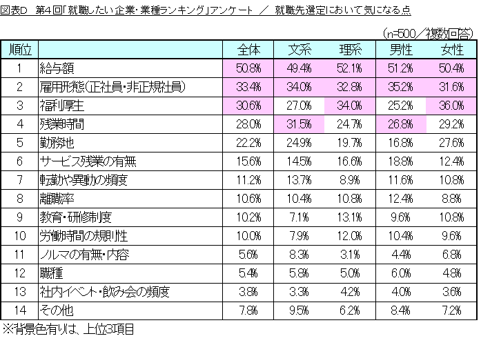 就職先の選定において気になる点では「給与額」(回答率50.8%)が1位、「雇用形態(正社員・非正規社員)」(同33.4%)が2位、「福利厚生」(同30.6%)が3位となり、以下、「残業時間」(同28.0%)、「勤務地」(同22.2%)と続きました。特に「給与額」への関心の高さが際立つ結果となりました。(図表D)
