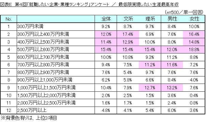 さらに「給与額」について最低限実現したい生涯最高年収を調査したところ、「500万円以上600万円未満」(同 15.4%)が最も多く、「300万円以上400万円未満」(同 12.0%)が2位、「400万円以上500万円未満」(同 11.4%)が3位となりました。特に文系と比べて理系の学生、女性と比べて男性の学生において「1,000万円以上1,500万円未満」の高い年収を望む傾向が強くうかがえる結果となりました。(図表E)