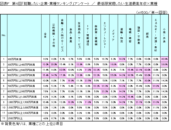 また、最低限実現したい生涯最高年収を就職したい業種ごとにみると「エネルギー・資源・素材」において、1,000万円以上の高い年収を希望する割合が44.4%と最も高い一方で、「小売・外食」においては「300万円未満」の割合が42.9%と最も高く、1,000万円以上の高い年収を希望する割合は0.0%となるなど、希望する業種によって期待する年収に大きな差が出る結果となりました。(図表F)