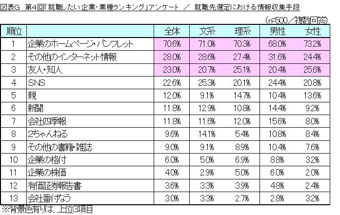 就職先の選定における情報収集手段としては「企業のホームページ・パンフレット」(同70.6%)が圧倒的に多く、次いで「その他のインターネット情報」(同28.0%)、「友人・知人」(同23.0%)、「SNS」(同22.6%)、「親」(同12.0%)と続きました。(図表G)
