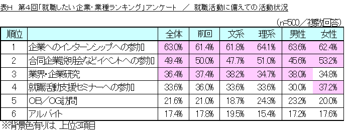 就職活動に備えた活動としては、「企業へのインターンシップへの参加」(回答率63.0%)が最も多く、「合同企業説明会などイベントへの参加」(同49.4%)、「業界・企業研究」(同36.4%)と続きました。前回との比較では「就職活動支援セミナーへの参加」が減少する一方で「企業へのインターンシップへの参加」が増加していることから、就職活動生は企業のインターンシップに参加することが採用の近道であると考えていることがうかがえます。(図表H)