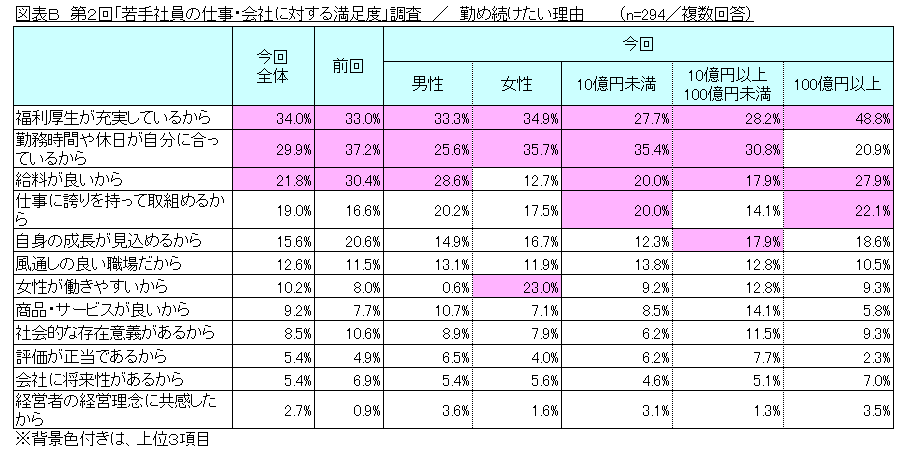 「3年後も勤務し続けていると思う」と選択した理由を尋ねたところ、1位「福利厚生が充実しているから」(回答率 34.0%)、2位「勤務時間や休日が自分に合っているから」(同 29.9%)、3位「給料が良いから」(同 21.8%)という結果となりました。男女別では、男性において「給料が良いから」(同 28.6%)、女性において「女性が働きやすいから」(同 23.0%)という回答が異性に比べて高い結果となりました。(図表B)