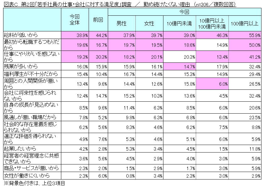 一方「3年後は勤務し続けていないと思う」と選択した理由を尋ねたところ、1位「給料が低いから」(回答率 38.9%)が前回調査に続いて圧倒的に高い回答率となり、2位「最初から転職するつもりだから」(同 19.6%)、3位「仕事にやりがいを感じないから」(同 19.3%)という結果となりました。「給料が低いから」は前回調査に続いて1位となっており、給料が今後の勤続意欲における重要な要素となっていることがうかがえます。また、勤務している会社の売上高規模別に集計したところ、全ての区分において「給料が低いから」が1位となっており、売上高規模が大きい会社に勤めている若手社員ほど給料に不満を持っている様子が見受けられます。売上高100億円以上の大企業に勤めている若手社員は「最初から転職するつもりだから」(同 50.0%)、「仕事にやりがいを感じないから」(同 41.2%)などの回答率が高く、売上高規模の小さい企業に勤務している若手社員に比べて、不満を感じている人の割合が高い様子がうかがえます。(図表C)