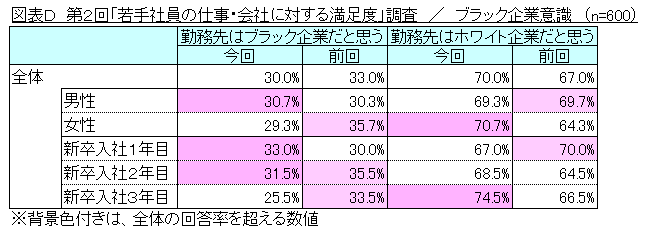 勤務先に対するブラック企業の意識について調査したところ「勤務先はブラック企業だと思う」(回答率 30.0%)は「勤務先はホワイト企業だと思う」(同 70.0%)を下回りましたが、前回調査と同様におよそ3人に1人は自身が勤務する会社がブラック企業だと感じているという結果となりました。男女別、入社年次別においてもほぼ同様の結果となっています。(図表D)
