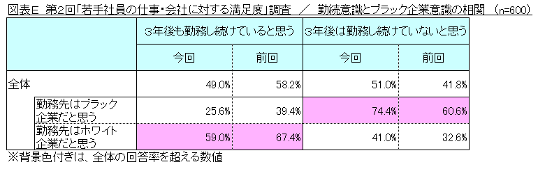 また前回調査においては、勤務先がブラック企業だと思っていても約4割が3年後も勤務し続けていると考えていたのに対して、今回の調査では同様の条件の回答率が25.6%と大幅に低下しており、自身がブラック企業だと判断した場合にはいち早く見切りをつけて転職に動こうと考えている若手社員が増加している様子がうかがえる結果となりました。(図表E)