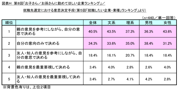 また第5回「就職したい企業・業種ランキング」によれば、就職先を選定するにあたり「自分の意思のみで決める」(回答率34.3%)と回答する学生に対し、「親の意見を参考にしながら、自分の意思で決める」(同40.5%)と回答する学生が上回っており、就職先の選定において親の意見が重要視されています。(図表H)