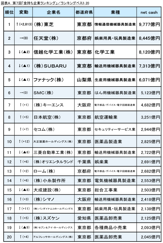 決算書の記載に基づき算出したNetCash(※)を比較した「金持ち企業ランキング」のランキング1位は「東芝」(NetCash9,777億円)でした。次いで「任天堂」が2位(同8,445億円)、「信越化学工業」が3位(同8,120億円)となり、以下「SUBARU」(同7,313億円)、「ファナック」(同6,071億円)、「SMC」(同5,123億円)、「キーエンス」(同4,682億円)、「日本航空」(同3,251億円)と続きました。