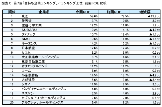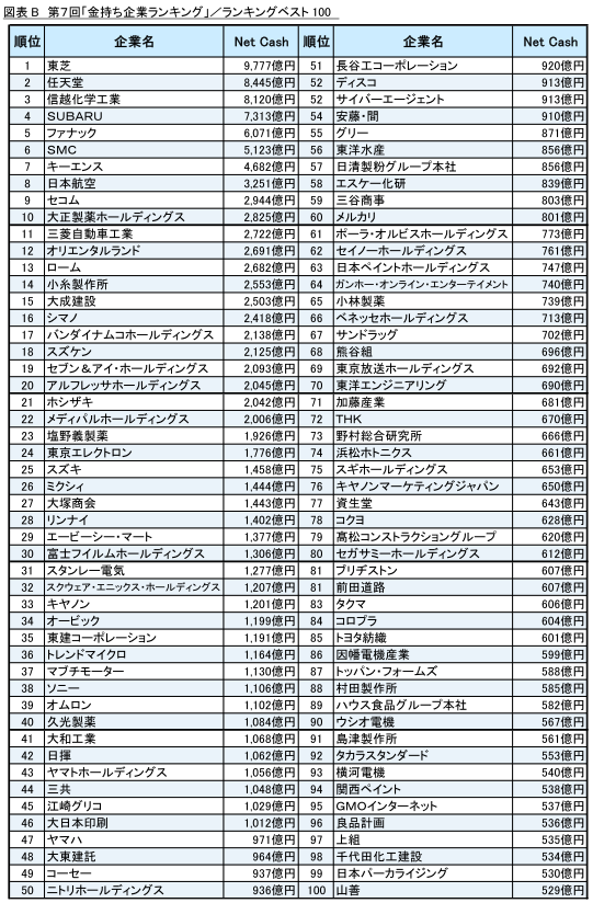 前回順位との比較においては、「東芝」の大幅ランクアップ(2,813位→1位)が目立ちます。同社は、経営再建の一環として有力事業(子会社)を他社に売却し、多額のCashを獲得したことによりランクインしたものと考えられます。また、10位の「大正製薬ホールディングス」(前回22位)は、大幅にランクアップし、前回上位20社圏外からの上位進出となりました。その他、17位「バンダイナムコホールディングス」(同28位)は、前回から大きくランクを上げていますが、その他は上位の顔ぶれに大きな変化は見受けられない結果となりました。(図表A)