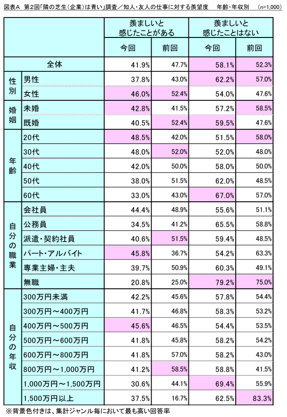 一方、「羨ましいと感じたことがない」との回答率としては、職業別では「無職」(同 79.2%)、「公務員」(同 65.5%)、年収別では「1,000 万円~1,500 万円」(同 69.4%)、「1,500 万円以上」(同62.5%)の高収入層において、高い結果となりました。(図表A)