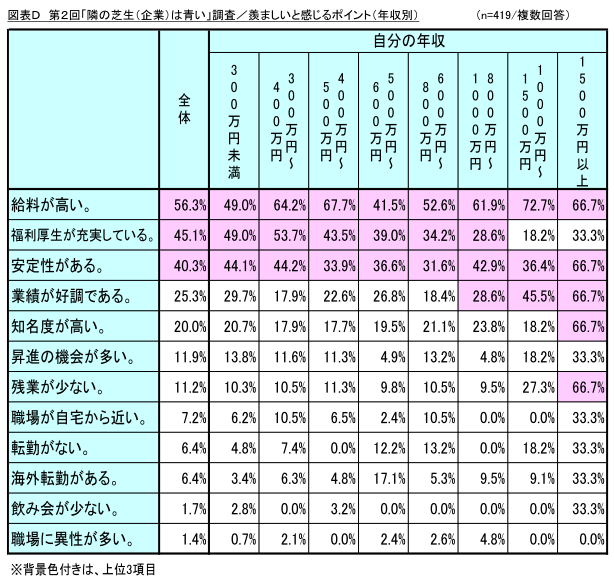 また、羨ましいと思うポイントを年収別に集計したところ「1,000 万円~1,500 万円」と「1,500 万円以上」の高収入層において、「福利厚生が充実している」が上位3項目に入らず、「残業が少ない」との回答率が他の年収層よりも高い結果となりました。(図表D)