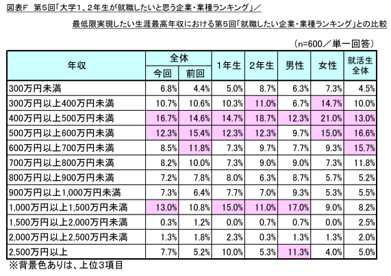また「給与額」について最低限実現したい生涯最高年収を調査したところ「400万円以上500万円未満」(同16.7%)が最も多く、「1,000万円以上1,500万円未満」(同13.0%)、「500万円以上600万円未満」(同12.3%)の順となりました。民間企業の平均年収441万円(平成30年民間給与実態統計調査)を満たす400万円以上600万円未満に回答が集中していることを考慮すると、前回までと同様に「給与額」は平均年収以上の水準であればよいと考えている学生が多く存在していることがわかります。「1年生」や「男子」においては、1,000万円以上の年収を求める割合が高い一方、「2年生」や「第5回就職したい企業・業種ランキング調査」における「就職活動生」においては、その割合が低下していることから、2年生や就職活動生は、1年生に比べて現実的な就職先をイメージしていることが考えられます。(図表F)