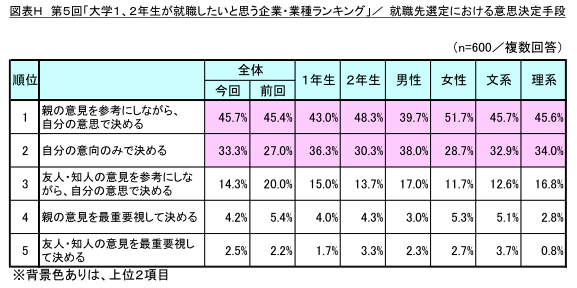 就職先を選定する際の意思決定手段について調査したところ、「親の意見を参考にしながら、自分の意志で決める」(同45.7%)が最も多く、次いで「自分の意志のみで決める」(同33.3%)、「友人・知人の意見を参考にしながら、自分の意思で決める」(同14.3%)の順となり、就職先は自らの意志で決めたいと考えている学生が多い結果となりました。(図表H)