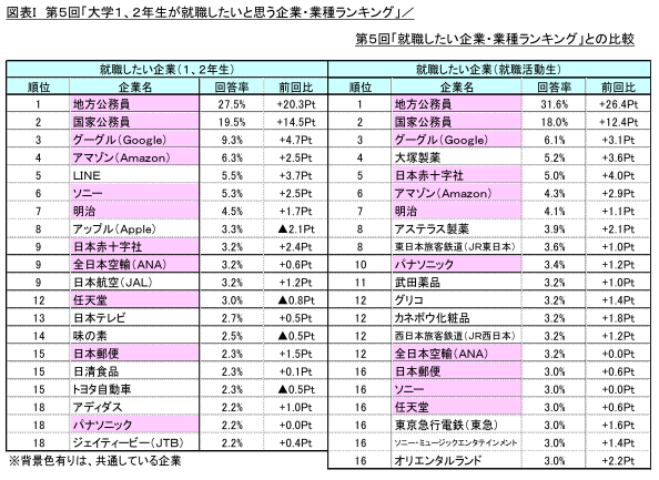 今回の調査では公務員の人気が再び高まり、1位と2位を独占しました。民間企業では3位「グーグル(Google)」、4位「アマゾン(Amazon)」に加えて、5位に「LINE」が新たにランクインし、学生が日頃からスマートフォン等でよく利用するIT関連企業の人気が上昇しました。